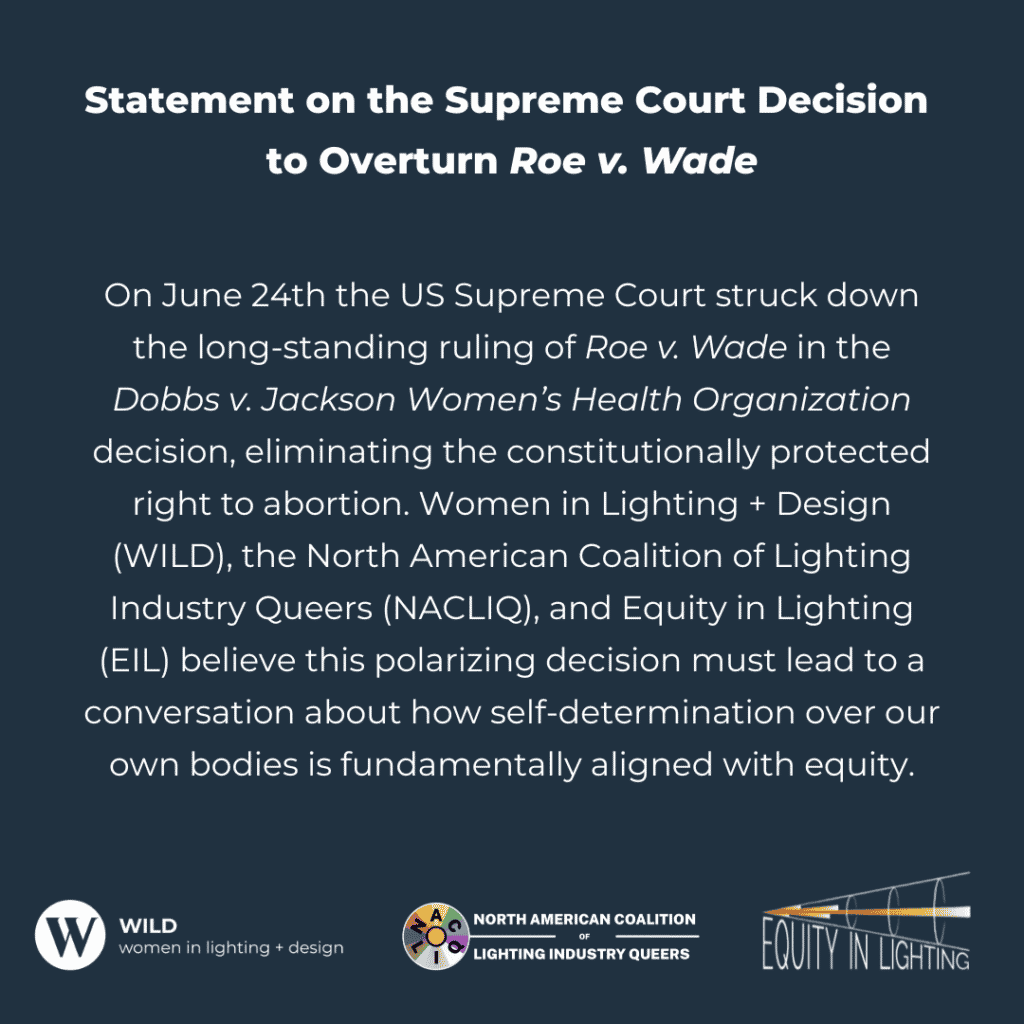We at the DLFNY support the statement made by WILD (Women in Lighting Design), NACLIQ, and EIL regarding the recent Supreme Court overturning of Roe vs. Wade.